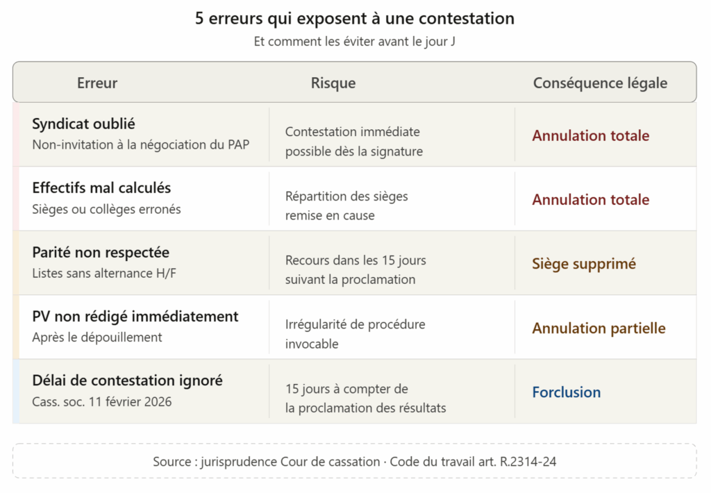 C’est l’une des causes d’annulation systématique. L’oubli d’un seul syndicat dans l’invitation à négocier le protocole peut entraîner l’annulation de l’ensemble du processus. Exemple concret : une PME industrielle a vu ses élections annulées et reportées de 4 mois parce qu’un syndicat avait été écarté des négociations.