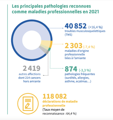 S’agissant des maladies professionnelles, la grande majorité sont liées à des troubles musculosquelettiques (TMS), en témoigne ce graphique publié dans le rapport annuel de l’assurance maladie en novembre 2022.