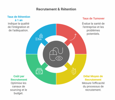 | Coût par Recrutement | (Coût total du processus / Nb de recrutements) + Coût d’intégration | Permet d’optimiser les canaux de sourcing et de budgéter les campagnes de recrutement. |