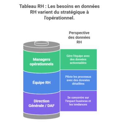 - Direction Générale / DAF : Besoin d’une vision stratégique et synthétique (turnover, coûts RH, engagement, diversité). Focus sur l’impact business et les tendances..